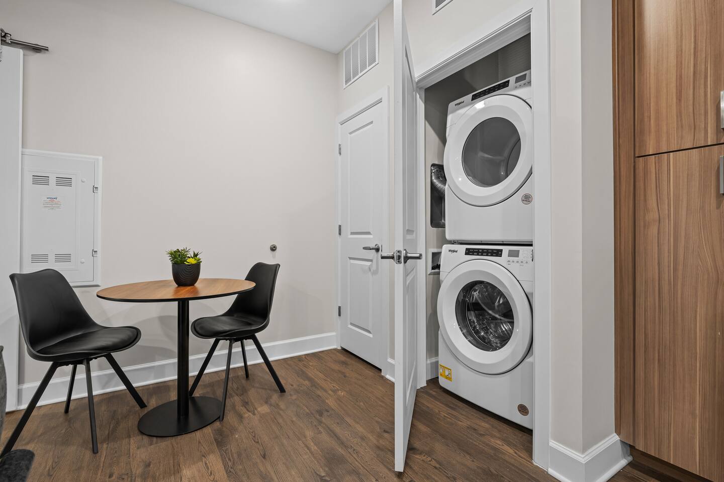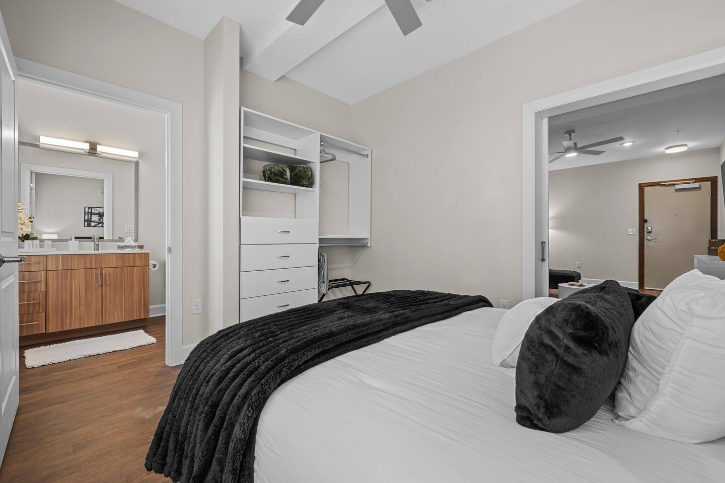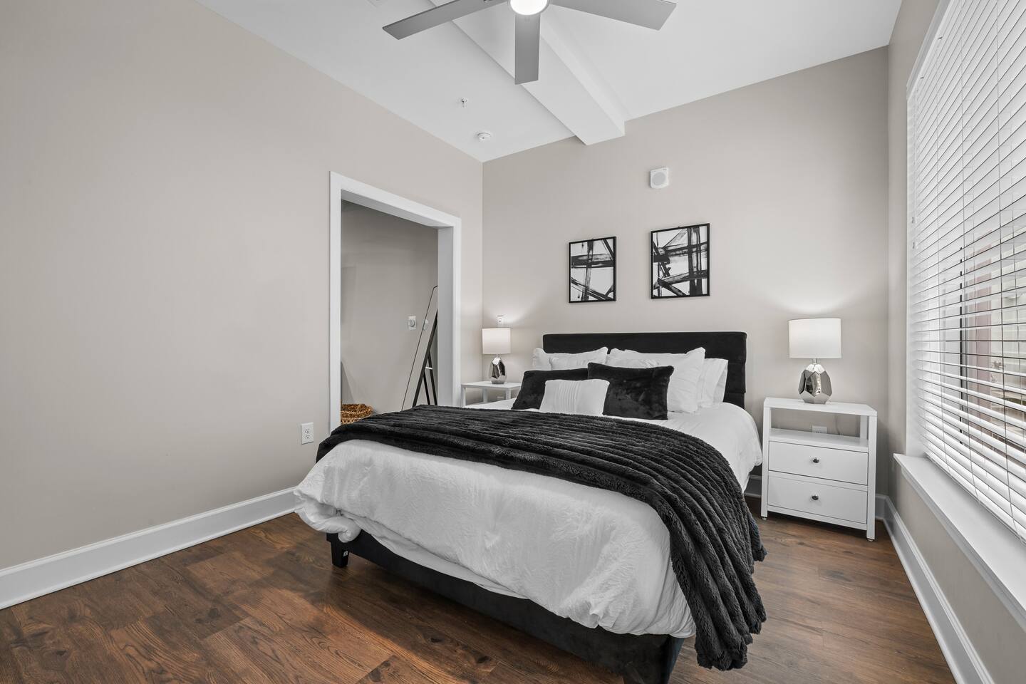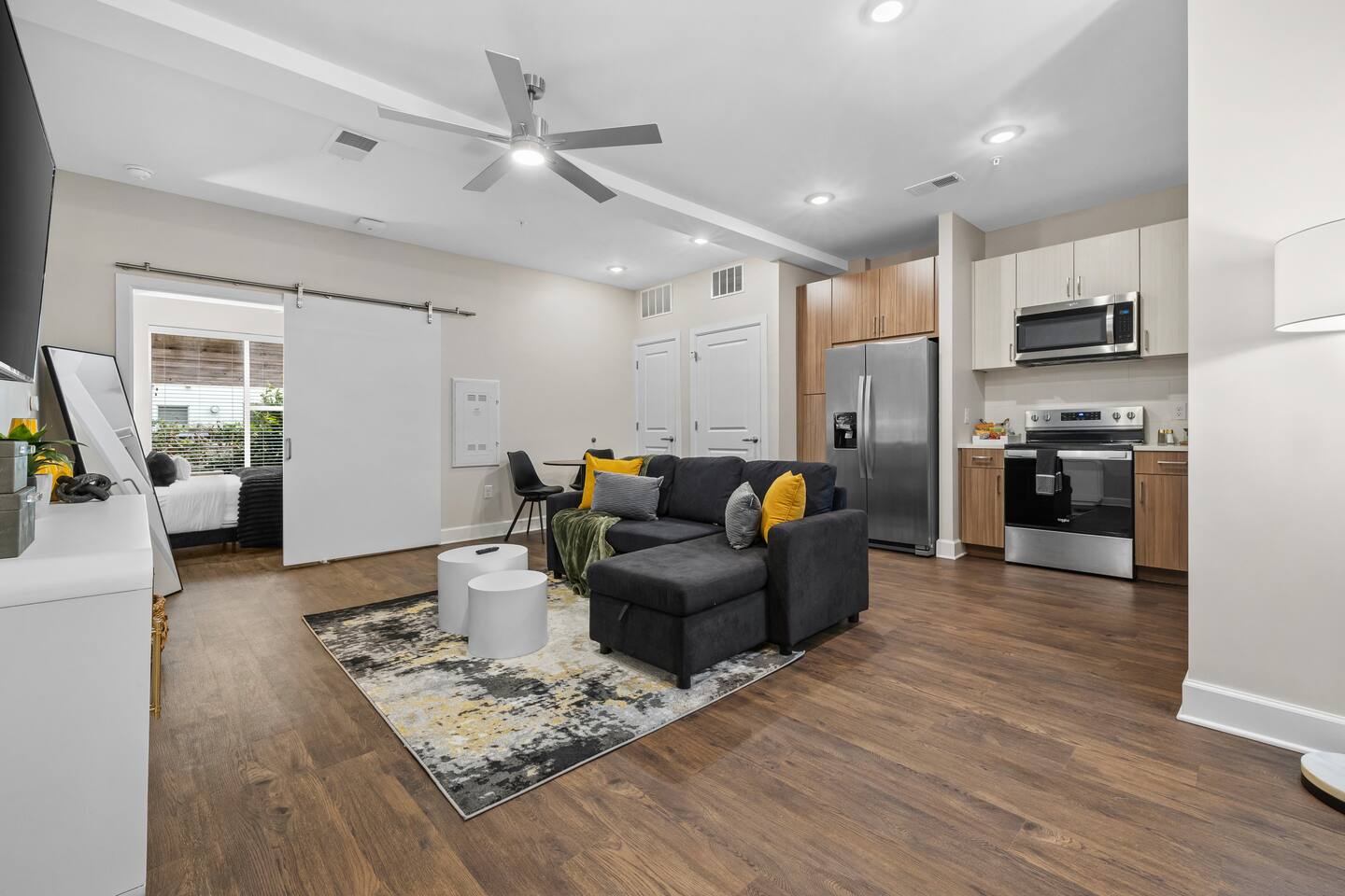Stay in style at this sleek black-and-white 1BR apartment just a 15-minute walk to Broadway and steps from The Gulch. Perfect for couples or small groups, it features a queen bed, sofa sleeper, luxury air mattress, spa-style bathroom, and access to a rooftop pool, sky lounge, and fitness center. Explore Nashville’s best restaurants, music venues, and nightlife—all just minutes away.
