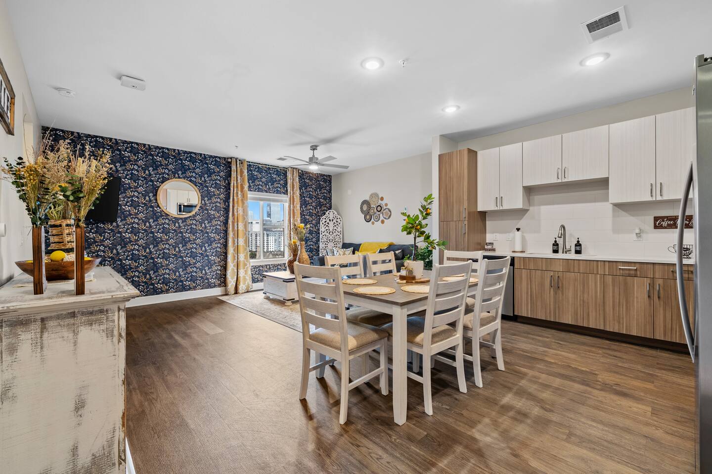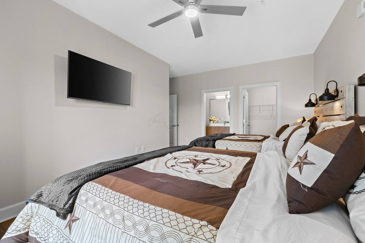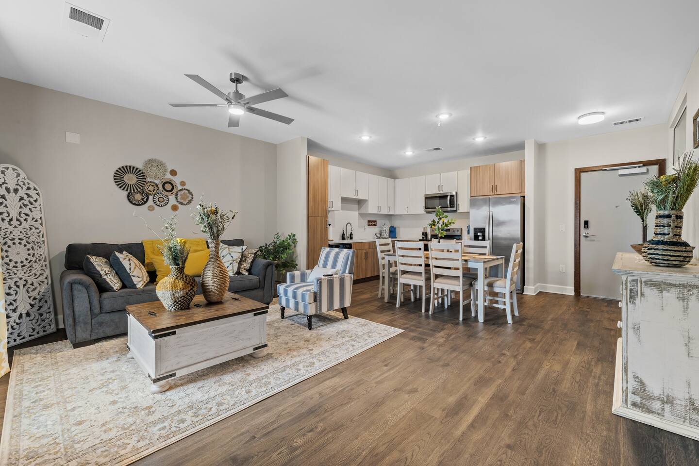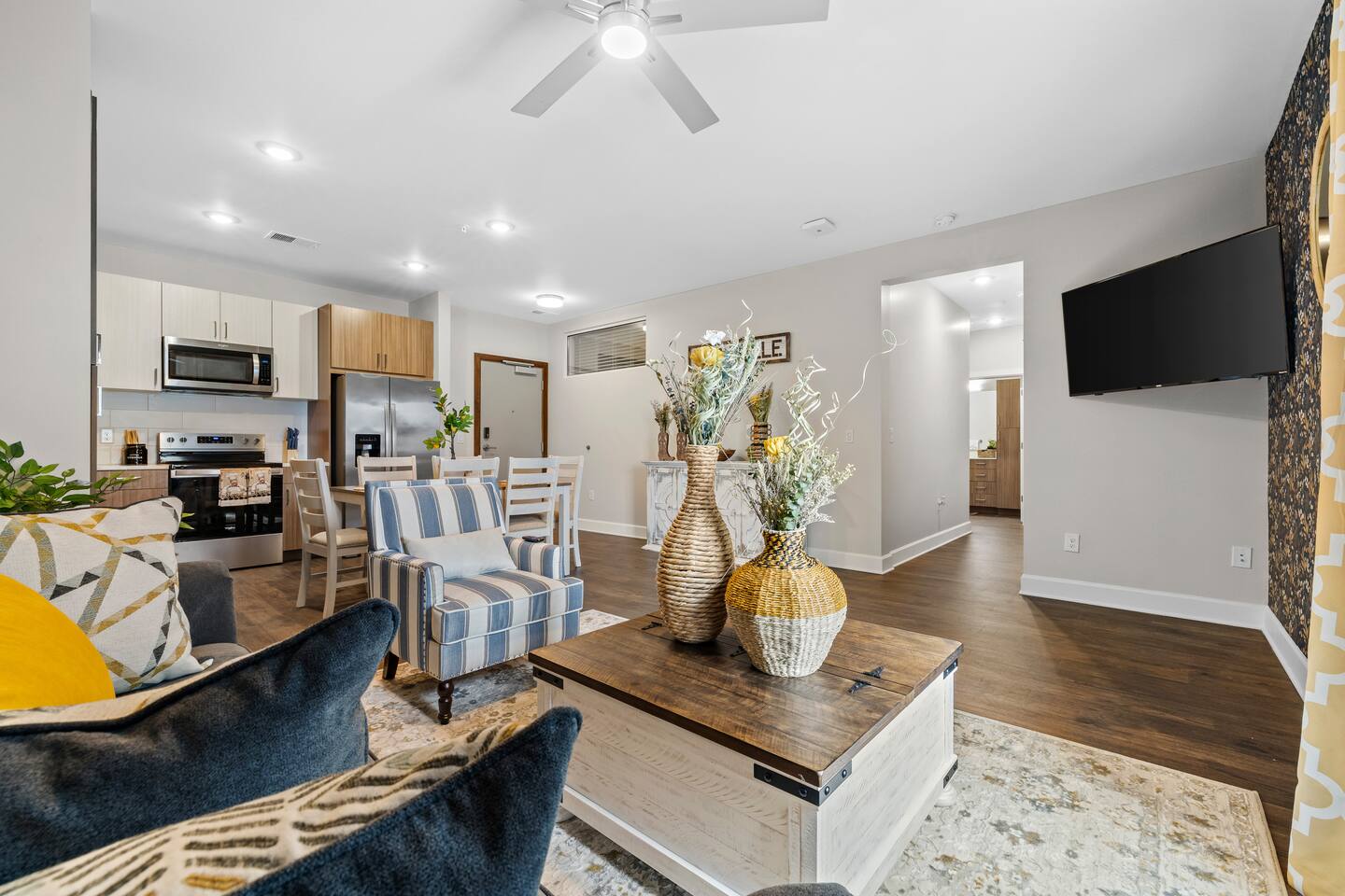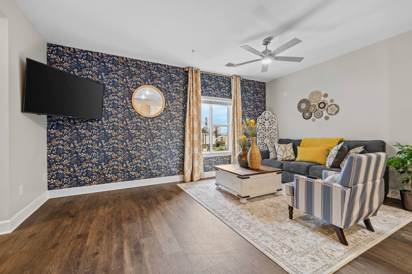 Experience refined Southern charm in this 2BR/2BA Nashville retreat just a short walk to The Gulch and Broadway. Sleeps 8 with a smart TV, a full kitchen, modern amenities, and access to a resort-style pool and gym. Blending country style with city comfort — it's the perfect space for your Music City stay.