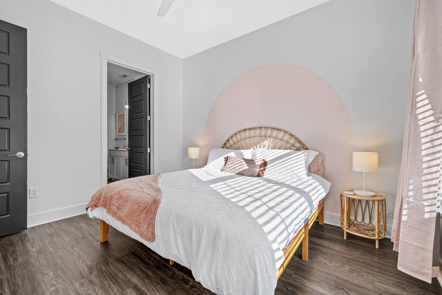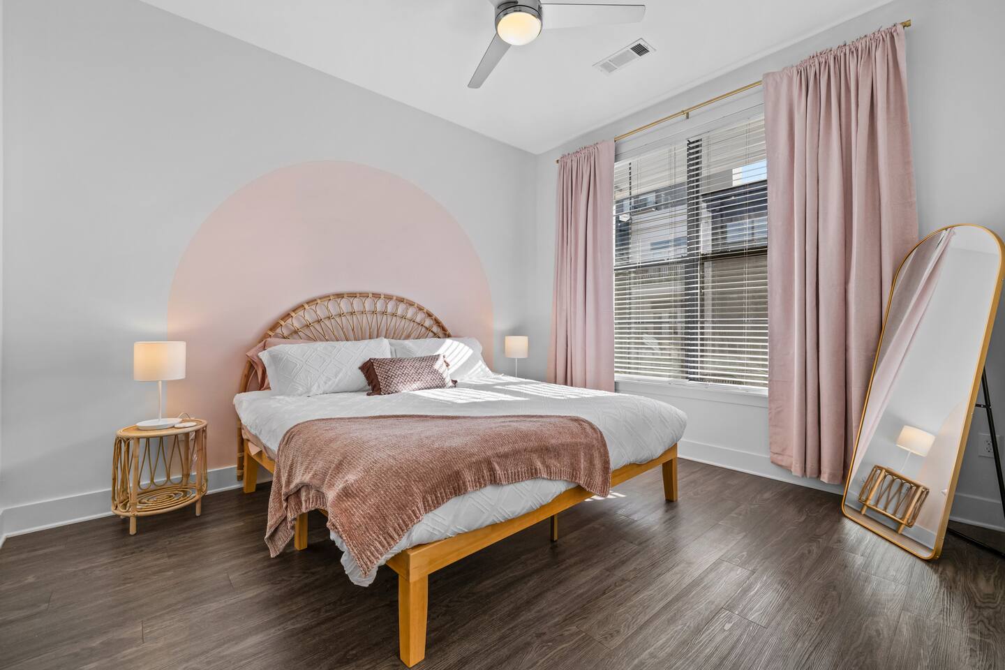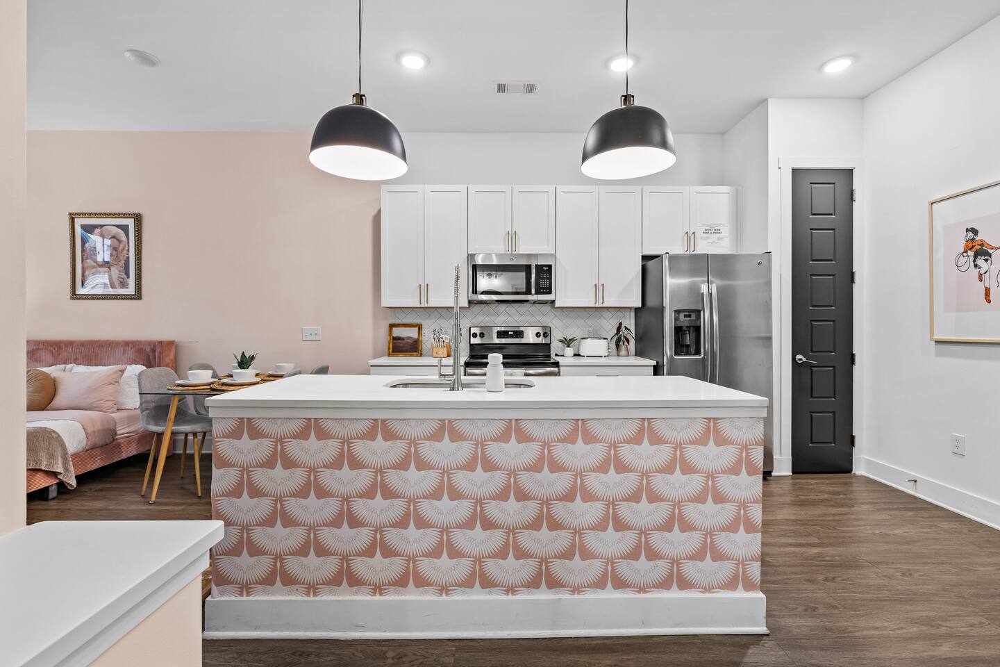 BEDROOM: One King-sized bed *bedroom has en-suite bathroom LIVING ROOM: Calming colors and high ceilings with two additional Queen beds and a smart TV. KITCHEN: The gourmet kitchen has stainless steel appliances, quartz countertops, and a large island. Stocked with dishware and cooking utensils. THE BURNHAM: A 6 story midrise apartment building located Downtown, south of Broadway aka SOBRO. There are 3 elevators and 3 sets of stairs inside the building. You'll find a stairwell a few feet to the apartment door that will take you straight to street level (exit from the garage). This apartment unit is located on the 5th floor, with a balcony that overlooks the pool and courtyard. LUXURY AMENITIES INCLUDED: ★ Outdoor pool (not heated) ★ 2 level fitness center & yoga studio ★ Climbing wall, treadmills, spin bikes ★ Sky lounge with deck & city views ★ The Collective: 2 story hangout & work ★ Fire pits, grills, cornhole ★ Courtyard Hangout Area ★ On-site Maintenance ★ On-Site Concierge & Security ★ Book your stay today! Parking: We have ONE reserved parking space available inside the building for an additional $35/night. The Parking Tag must be displayed on the rearview mirror or on the dash so the number is easily visible & your vehicle has to be parked in the space # listed on the tag - if these directions are not followed your car will be booted immediately at the guests expense! Extra vehicles can park in guest parking or a nearby parking lot for $35-$50/night (first come, first served and paid daily by parking meter).