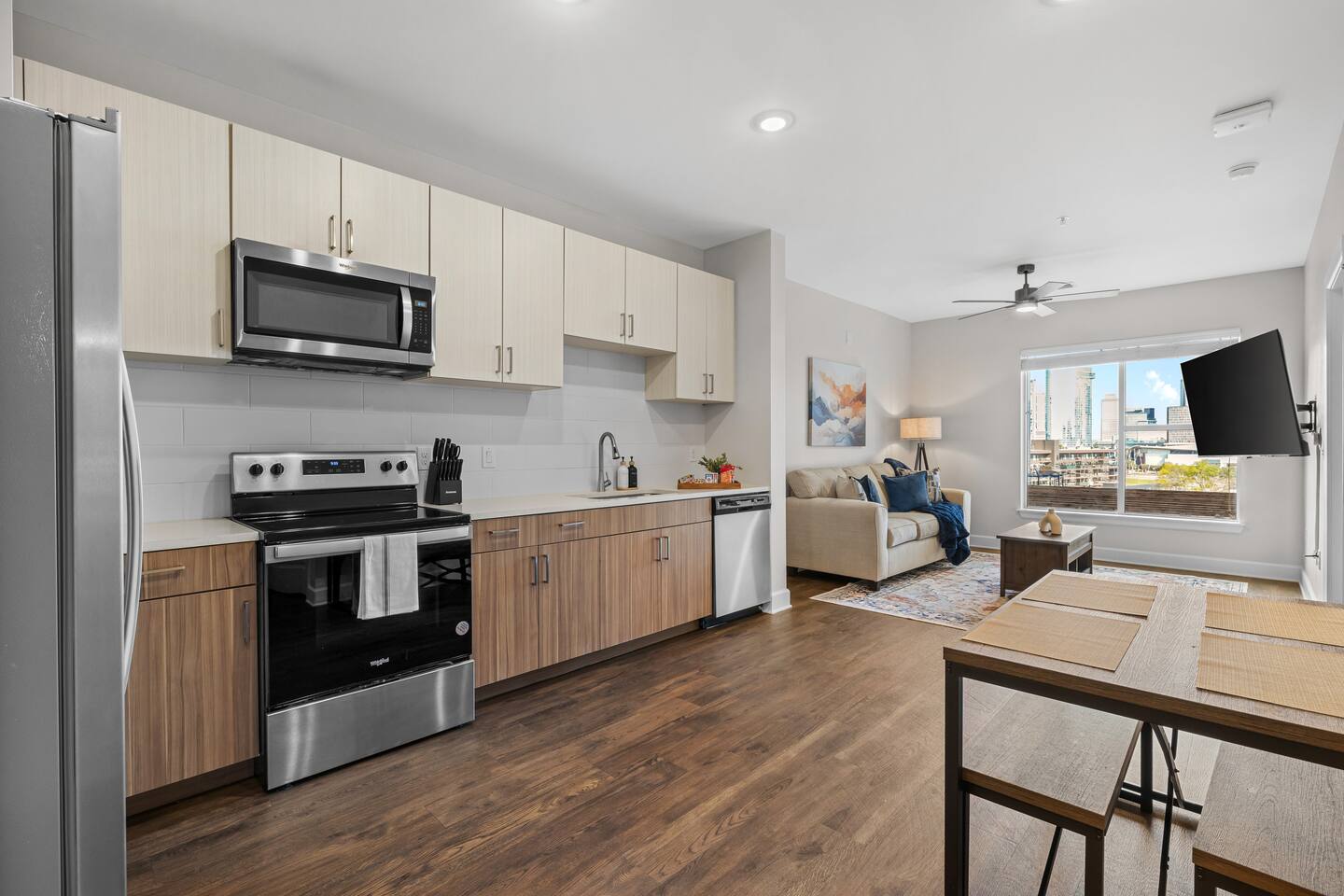 Bright, fun, and perfectly located, this 1BR/1BA apartment is just steps from The Gulch and a 15-minute walk to Broadway. Sleeps 6 with a queen bed, pullout sofa, and 2 rollaway beds. Enjoy vibrant decor, skyline views, and access to top amenities including a rooftop saltwater pool, sky lounge, and gym. Walk to live music, shopping, and Nashville’s best attractions. Ideal for couples, friends, or a group getaway in Music City!