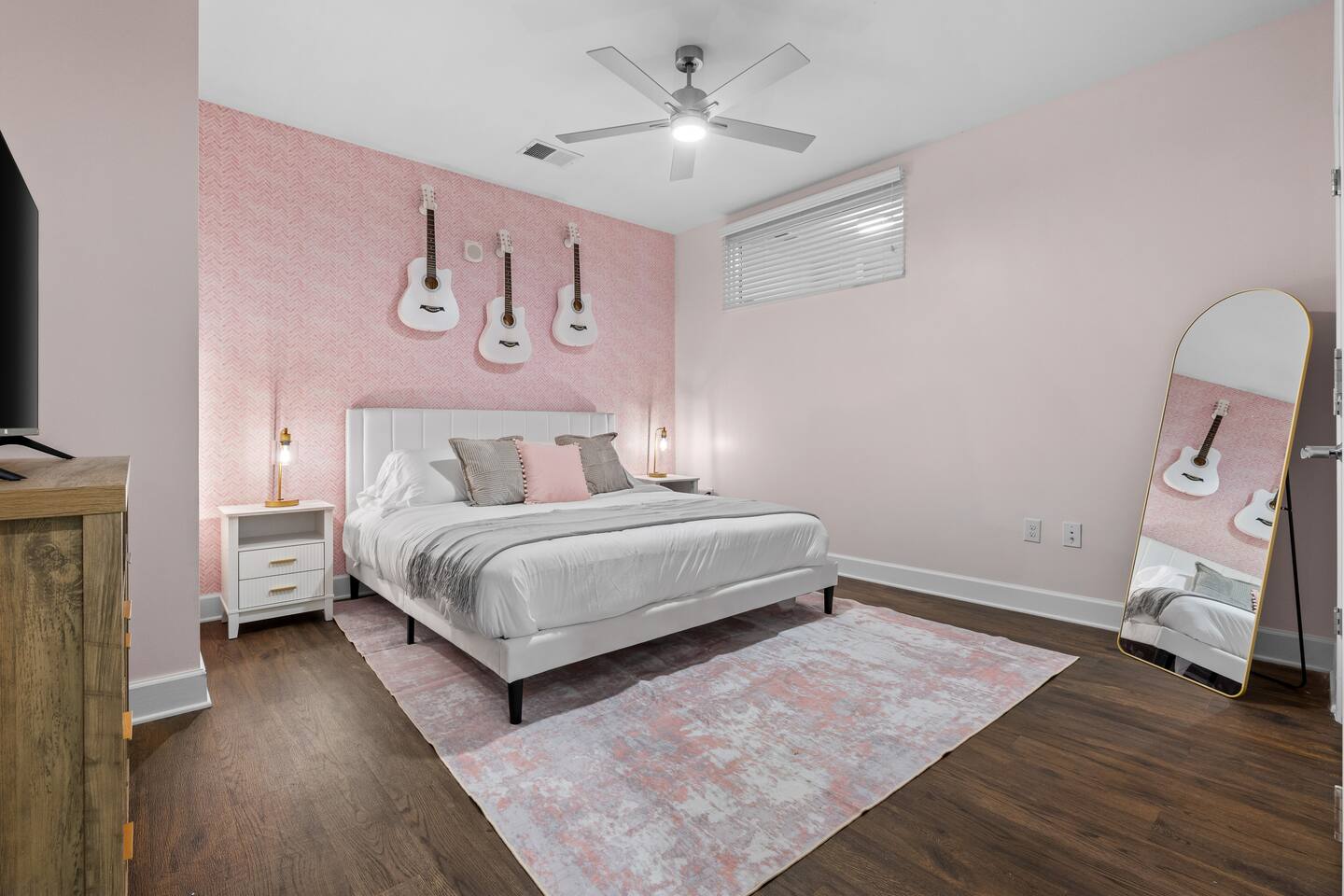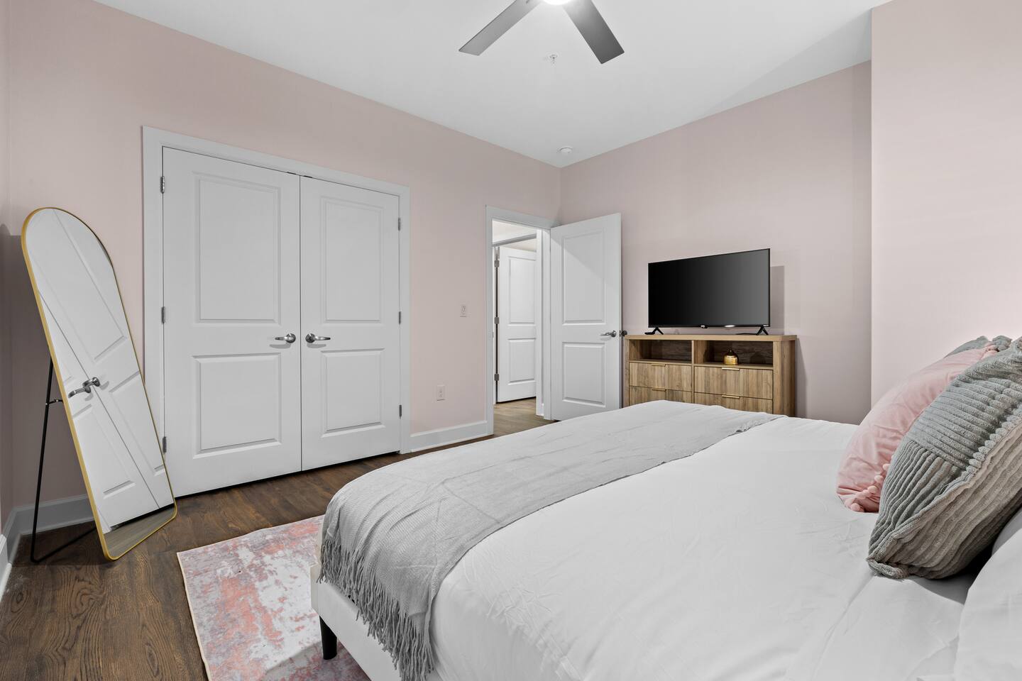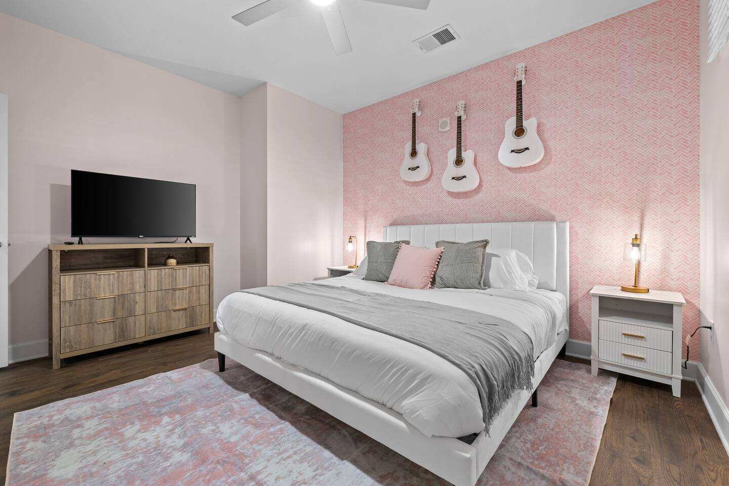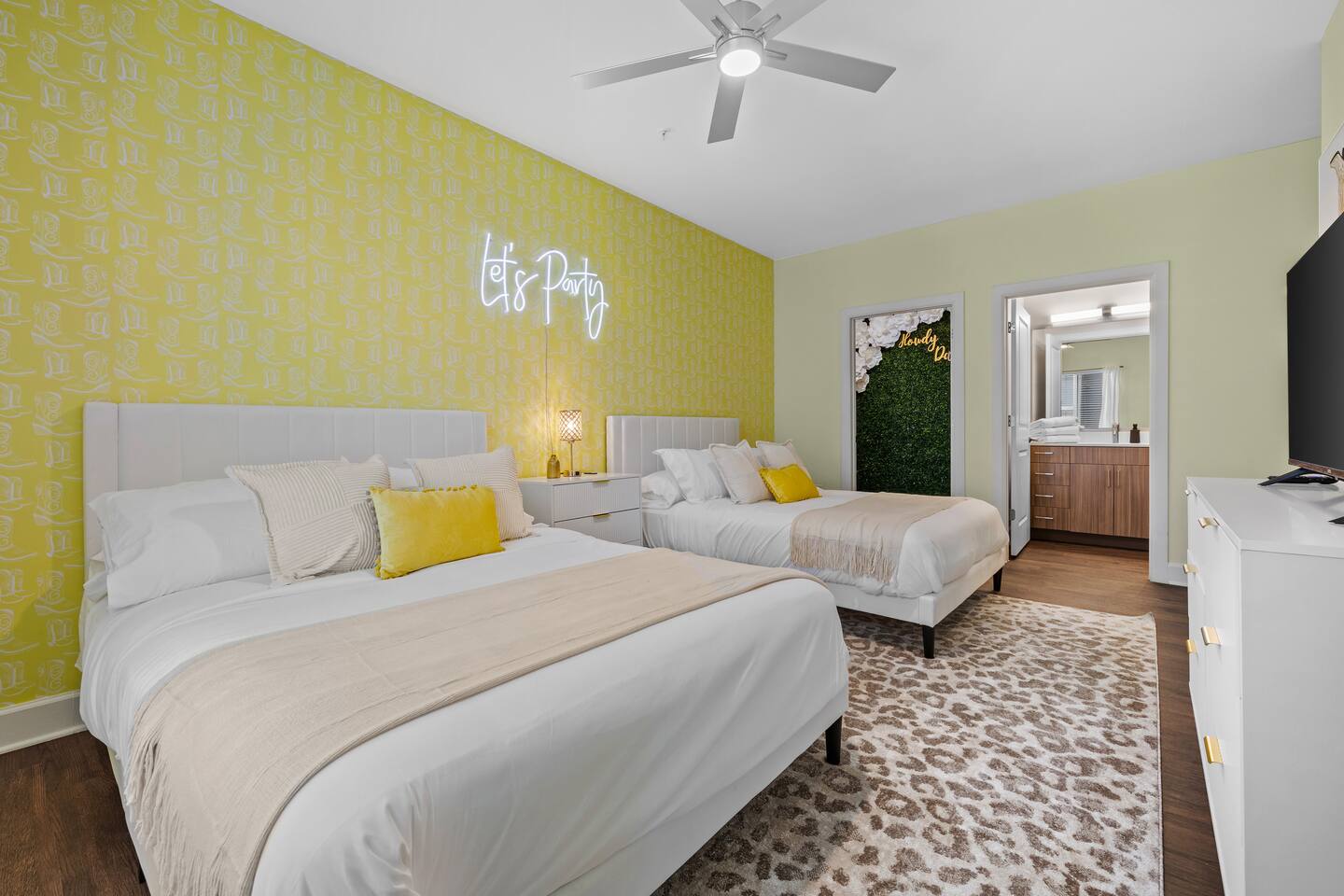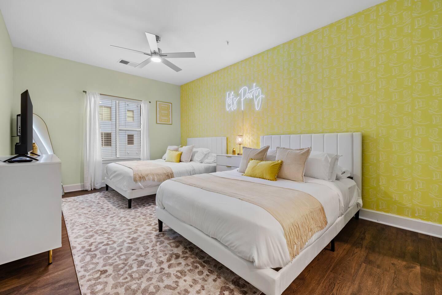Welcome to your Nashville home away from home! This boldly designed, fun, and comfortable 2-bedroom, 2-bathroom apartment offers the perfect stay for friends, couples, or families looking to explore the best of Music City. With a colorful Nashville-inspired interior and a prime location in one of the city’s most walkable neighborhoods, you’ll be just steps from top restaurants, nightlife, and iconic attractions. 🛏 The Space This thoughtfully appointed apartment includes: Bedroom 1: Spacious with a plush king bed and ensuite bathroom Bedroom 2: Two queen beds with stylish decor and lots of natural light Living Room: Comfy sofa sleeper + rollaway bed for flexible sleeping options Two full bathrooms with fresh towels, toiletries, and great lighting A dedicated glam/makeup station for getting ready in style (perfect for any night out!) Fully equipped kitchen with stainless steel appliances & modern finishes Smart TV, high-speed Wi-Fi, and a cozy living area for downtime Washer & dryer in-unit for extended stays or festival weekends 🏙 Building Amenities Enjoy access to premium on-site amenities during your stay: 🏊 Pool with skyline views – perfect for cooling off after a day in the city 💪 Modern fitness center 🛋 Resident lounge for working or unwinding 🛎 Secure building entry & elevator access 🚗 Parking available for $35/night (please request in advance; limited availability) 📍 Walk to Nashville's Best Located on Division Street in The Gulch, this apartment puts the city at your doorstep: 🎸 Broadway Honky Tonks – 15-minute walk to Tootsie’s, The Stage & more 🍽 Gulch Dining & Nightlife – 5-10 mins to Virago, Biscuit Love, LA Jackson 🏟 Bridgestone Arena – 10 mins for concerts & Predators games 🎭 Ryman Auditorium – 15-minute stroll to the iconic music venue 🏈 Nissan Stadium – 25-minute walk across the pedestrian bridge ☕ Coffee Spots – 5 mins to Barista Parlor, Killebrew, Frothy Monkey 🎉 The Ultimate Nashville Stay Whether you're here for live music, rooftop bars, a celebration weekend, or just exploring the city’s energy, this apartment delivers on style, space, and location. It's a vibrant but comfortable space that works equally well for a girls’ trip, guys’ getaway, couples weekend, or family escape. 📅 Availability fills quickly—book now and make the most of your time in Music City! Permit #2025010513