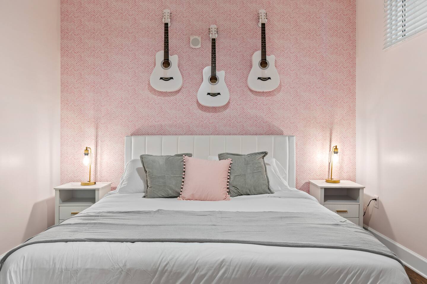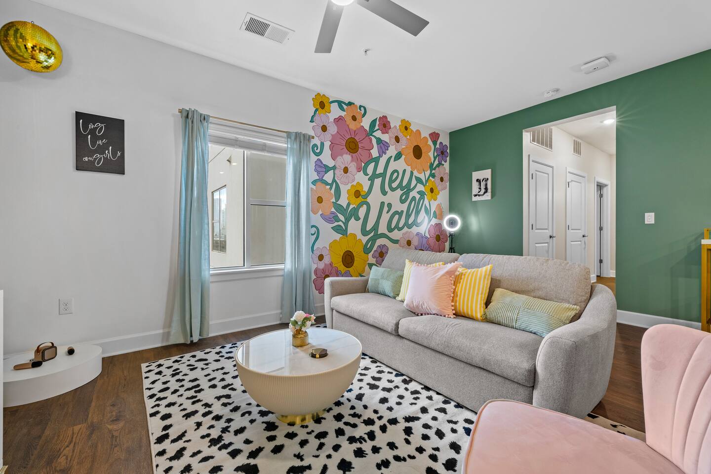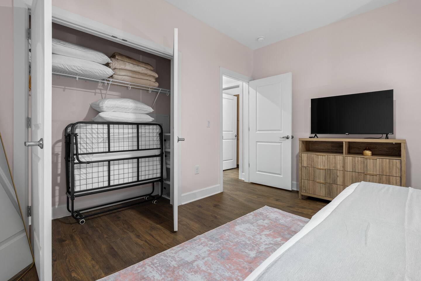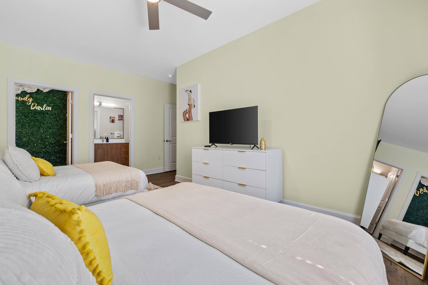Welcome to your Nashville home away from home! This boldly designed, fun, and comfortable 2-bedroom, 2-bathroom apartment offers the perfect stay for friends, couples, or families looking to explore the best of Music City. With a colorful Nashville-inspired interior and a prime location in one of the city’s most walkable neighborhoods, you’ll be just steps from top restaurants, nightlife, and iconic attractions. 🛏 The Space This thoughtfully appointed apartment includes: Bedroom 1: Spacious with a plush king bed and ensuite bathroom Bedroom 2: Two queen beds with stylish decor and lots of natural light Living Room: Comfy sofa sleeper + rollaway bed for flexible sleeping options Two full bathrooms with fresh towels, toiletries, and great lighting A dedicated glam/makeup station for getting ready in style (perfect for any night out!) Fully equipped kitchen with stainless steel appliances & modern finishes Smart TV, high-speed Wi-Fi, and a cozy living area for downtime Washer & dryer in-unit for extended stays or festival weekends 🏙 Building Amenities Enjoy access to premium on-site amenities during your stay: 🏊 Pool with skyline views – perfect for cooling off after a day in the city 💪 Modern fitness center 🛋 Resident lounge for working or unwinding 🛎 Secure building entry & elevator access 🚗 Parking available for $35/night (please request in advance; limited availability) 📍 Walk to Nashville's Best Located on Division Street in The Gulch, this apartment puts the city at your doorstep: 🎸 Broadway Honky Tonks – 15-minute walk to Tootsie’s, The Stage & more 🍽 Gulch Dining & Nightlife – 5-10 mins to Virago, Biscuit Love, LA Jackson 🏟 Bridgestone Arena – 10 mins for concerts & Predators games 🎭 Ryman Auditorium – 15-minute stroll to the iconic music venue 🏈 Nissan Stadium – 25-minute walk across the pedestrian bridge ☕ Coffee Spots – 5 mins to Barista Parlor, Killebrew, Frothy Monkey 🎉 The Ultimate Nashville Stay Whether you're here for live music, rooftop bars, a celebration weekend, or just exploring the city’s energy, this apartment delivers on style, space, and location. It's a vibrant but comfortable space that works equally well for a girls’ trip, guys’ getaway, couples weekend, or family escape. 📅 Availability fills quickly—book now and make the most of your time in Music City! Permit #2025010513