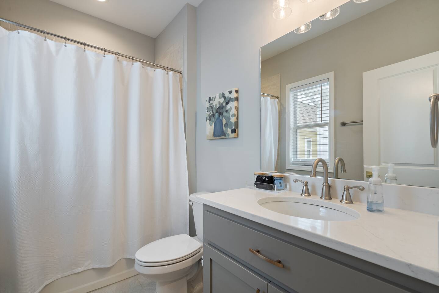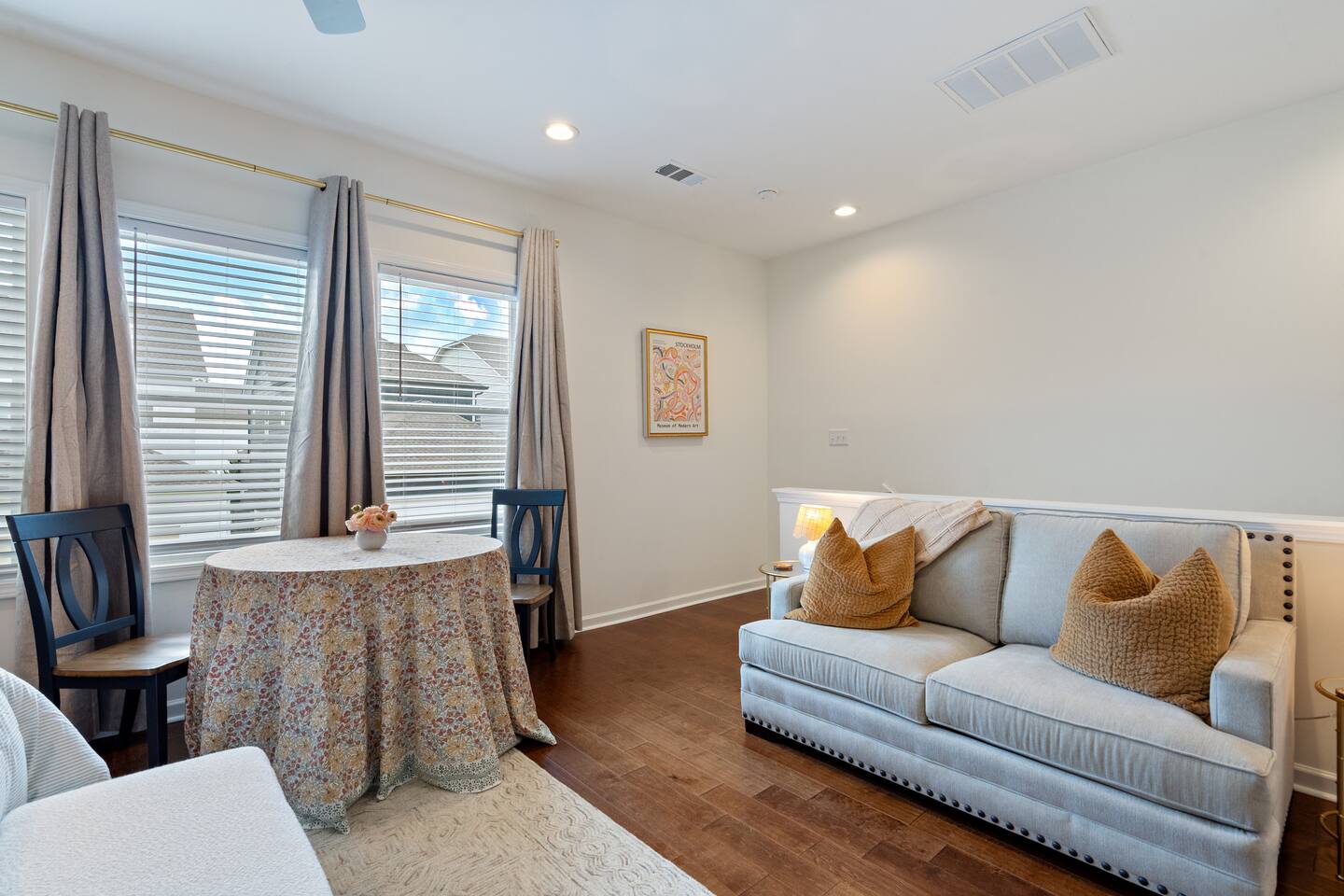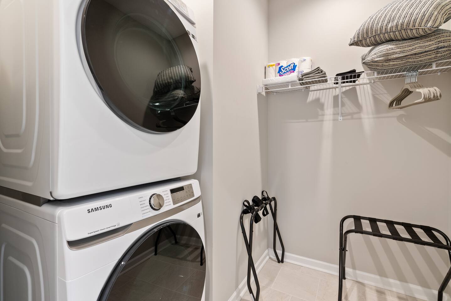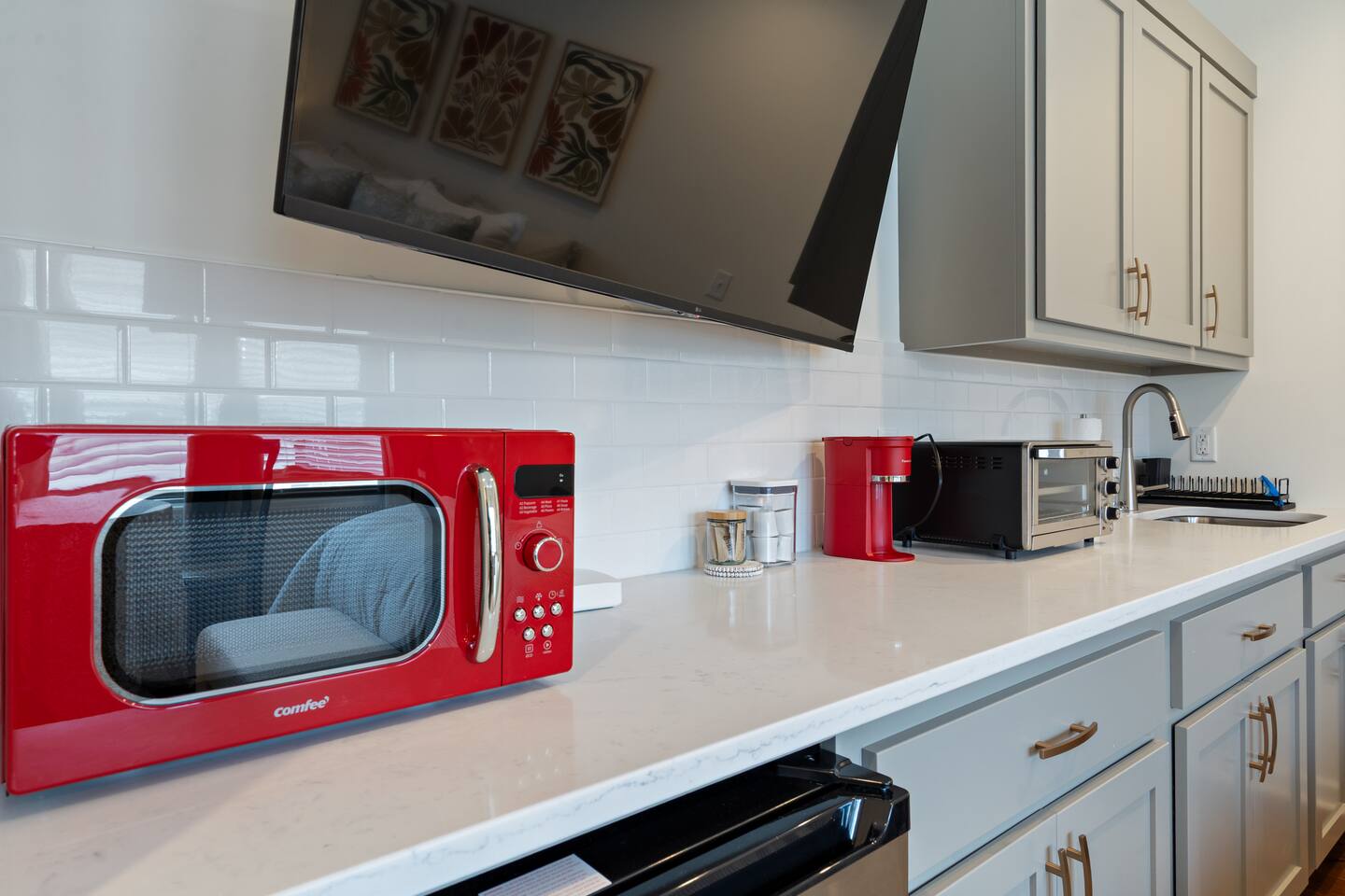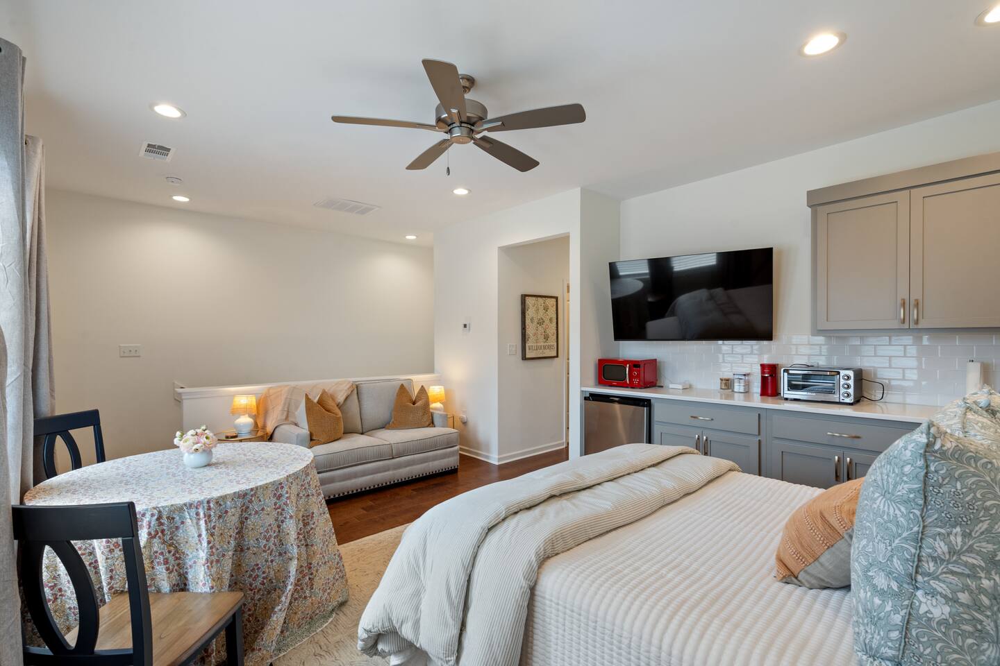 Located above the garage of the main house, this guest suite has its own private entrance and sleeps two. It features a super comfy queen bed with a 12" memory foam mattress, a 55" Smart TV for streaming your favorite movies and shows, and a loveseat. The bathroom includes luxe toiletries, a hair dryer, shampoo, conditioner, and body wash. Additional amenities include a full-size washer and dryer in the walk-in closet, and a countertop area with a sink, mini freezer/fridge, microwave, and Keurig coffee maker.
