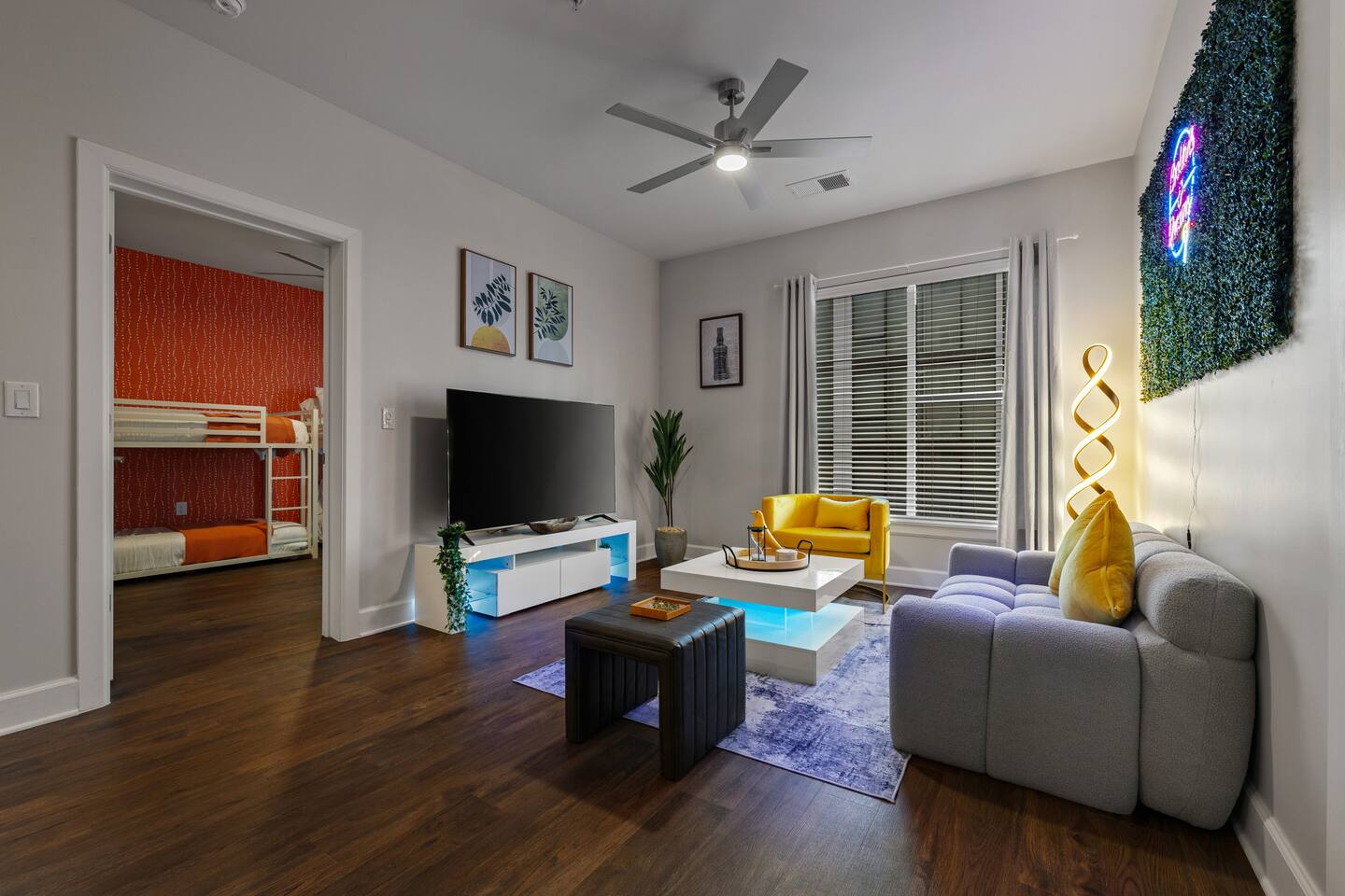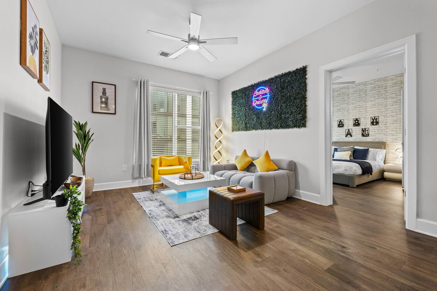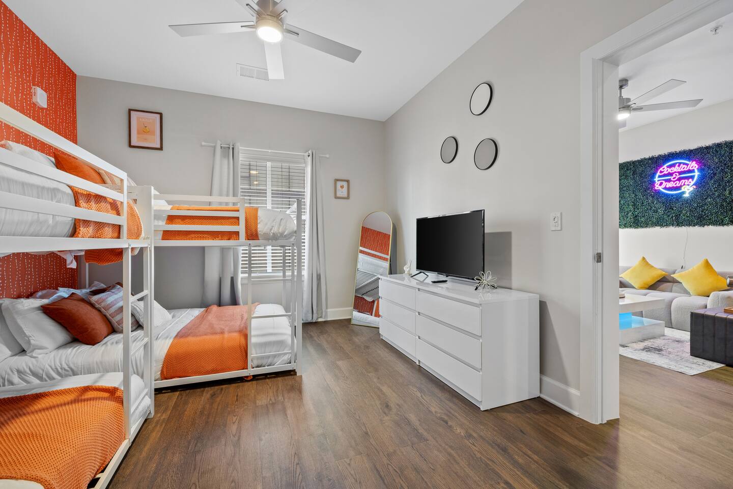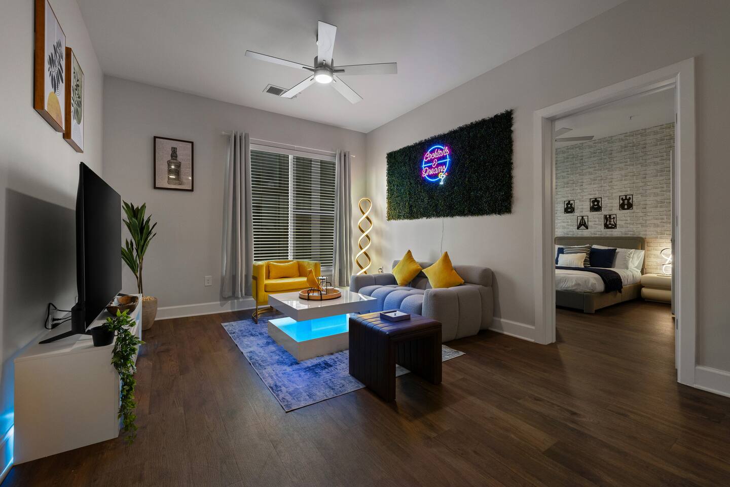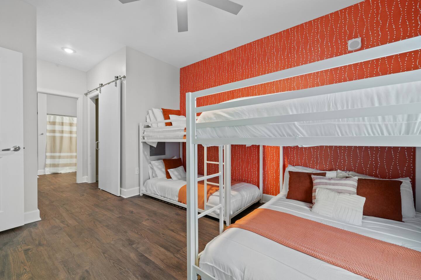 THE SPACE: This bright and modern 2-bedroom, 2-bathroom apartment is designed with vibrant pops of color and playful energy—perfect for groups and families who want comfort, convenience, and personality in the heart of Nashville. 🛏️ Sleeping Arrangements: 1 Full Bed (Primary Bedroom) 1 Bunk Bed with Full over Full 1 Bunk Bed with Twin over Twin 🍳 Fully stocked kitchen with stainless steel appliances 🛋️ Cozy and colorful living room for movie nights and hangouts 🛁 Two full bathrooms with modern finishes THE BUILDING: Set in a secure luxury complex, you’ll enjoy elevated amenities for a relaxing and fun-filled stay: 🏊 Infinity-edge pool with skyline views – the perfect chill zone 🌇 Rooftop lounge with seating and unbeatable sunset views 💪 Fitness center for an energizing workout 🚗 Parking available in the garage for $35/night THE LOCATION: Situated on buzzing Division Street, this location offers unbeatable access to Nashville’s best spots: 🎸 Broadway – Just a 10–12 minute walk to honky-tonks and live music 🍹 The Gulch – High-end dining, shopping & rooftop bars nearby 🏟 Bridgestone Arena & Nissan Stadium – For concerts, games, and events 🎤 Music Row & The Ryman – Immerse yourself in Nashville’s legendary music scene Whether you’re here to explore the sights, dance the night away, or unwind in a vibrant and stylish home base, this apartment has everything you need to enjoy the best of Music City. Permit #2025047007