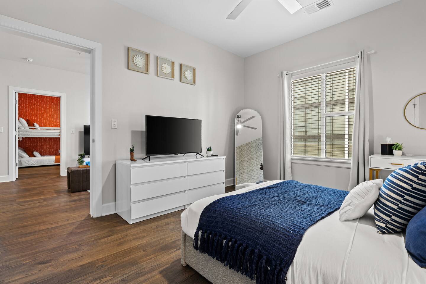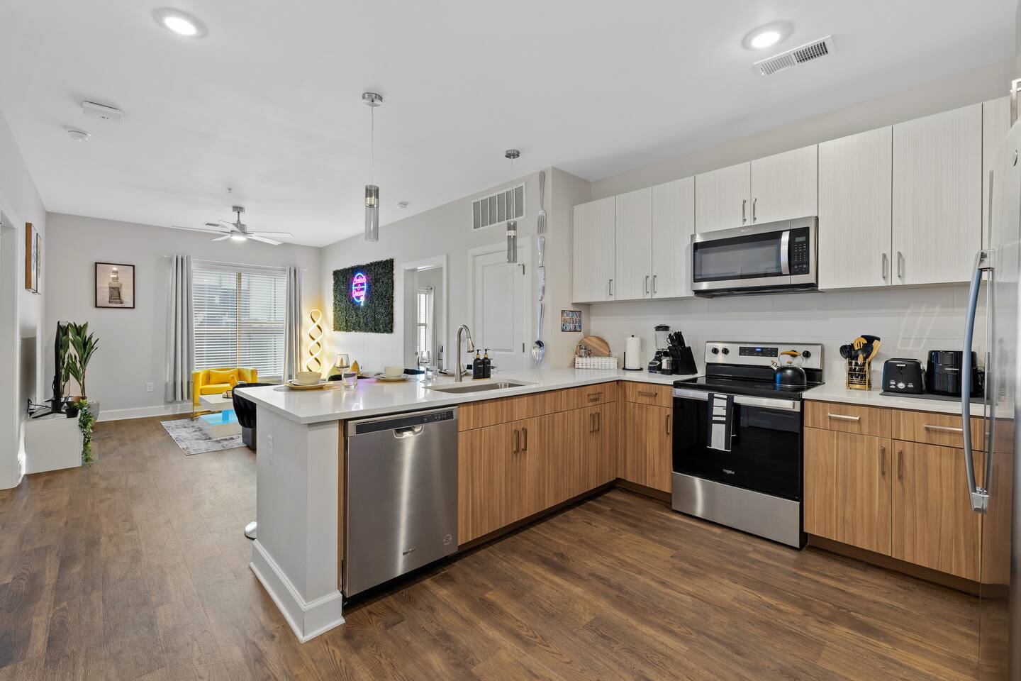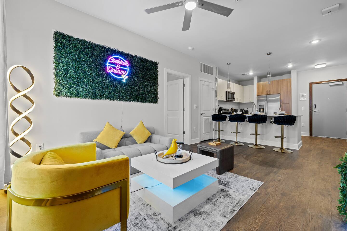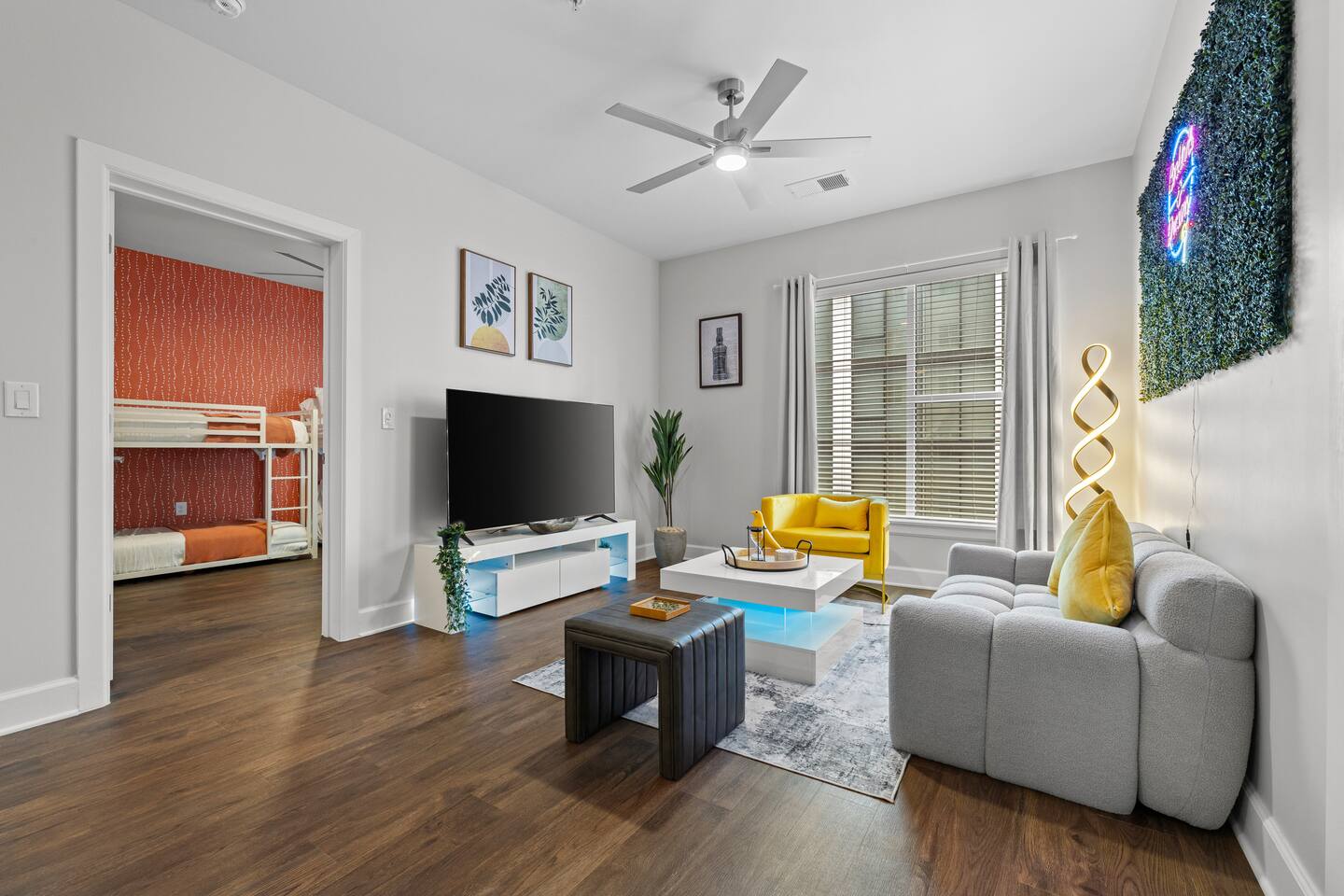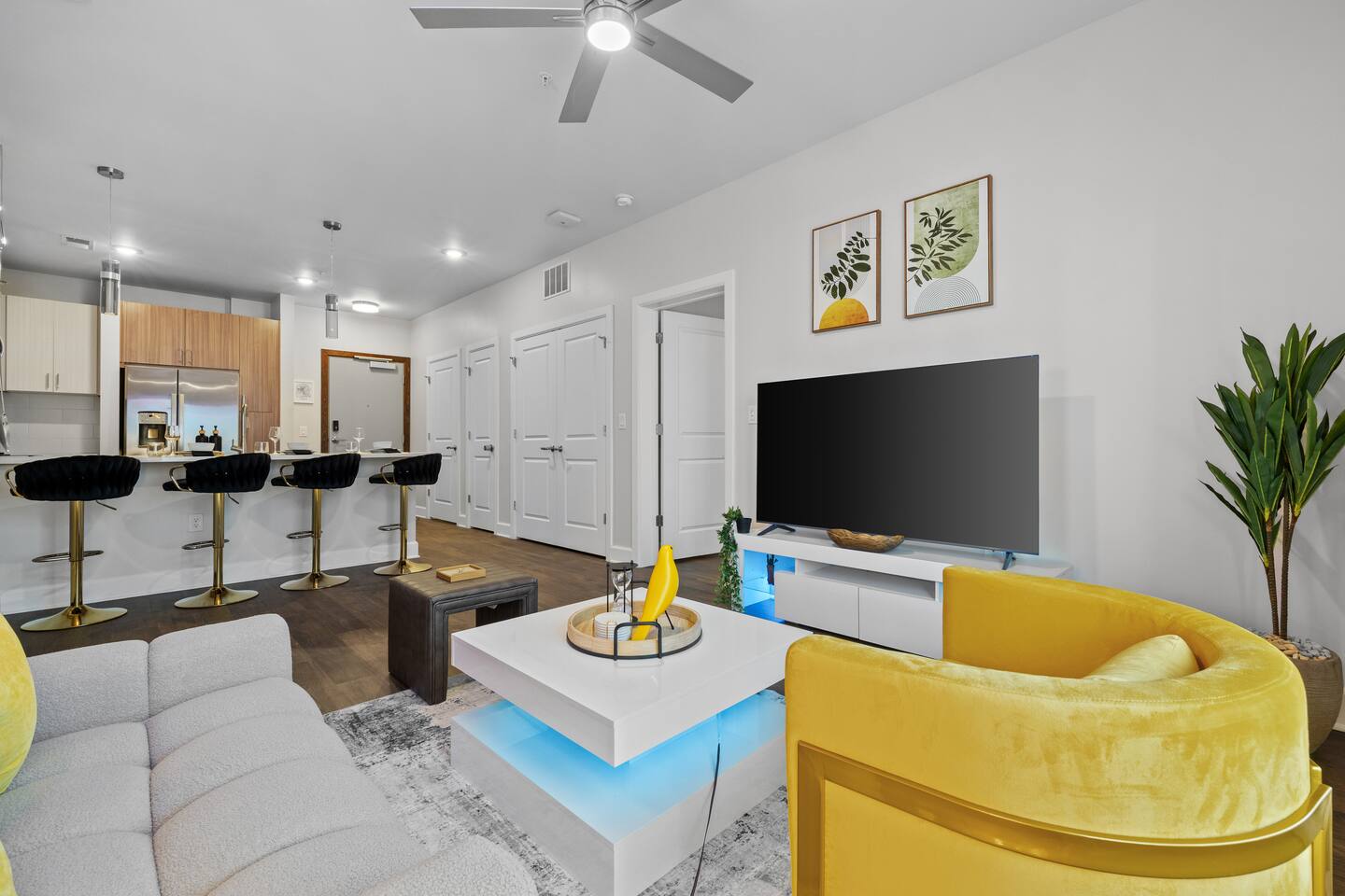 THE SPACE: This bright and modern 2-bedroom, 2-bathroom apartment is designed with vibrant pops of color and playful energy—perfect for groups and families who want comfort, convenience, and personality in the heart of Nashville. 🛏️ Sleeping Arrangements: 1 Full Bed (Primary Bedroom) 1 Bunk Bed with Full over Full 1 Bunk Bed with Twin over Twin 🍳 Fully stocked kitchen with stainless steel appliances 🛋️ Cozy and colorful living room for movie nights and hangouts 🛁 Two full bathrooms with modern finishes THE BUILDING: Set in a secure luxury complex, you’ll enjoy elevated amenities for a relaxing and fun-filled stay: 🏊 Infinity-edge pool with skyline views – the perfect chill zone 🌇 Rooftop lounge with seating and unbeatable sunset views 💪 Fitness center for an energizing workout 🚗 Parking available in the garage for $35/night THE LOCATION: Situated on buzzing Division Street, this location offers unbeatable access to Nashville’s best spots: 🎸 Broadway – Just a 10–12 minute walk to honky-tonks and live music 🍹 The Gulch – High-end dining, shopping & rooftop bars nearby 🏟 Bridgestone Arena & Nissan Stadium – For concerts, games, and events 🎤 Music Row & The Ryman – Immerse yourself in Nashville’s legendary music scene Whether you’re here to explore the sights, dance the night away, or unwind in a vibrant and stylish home base, this apartment has everything you need to enjoy the best of Music City. Permit #2025047007